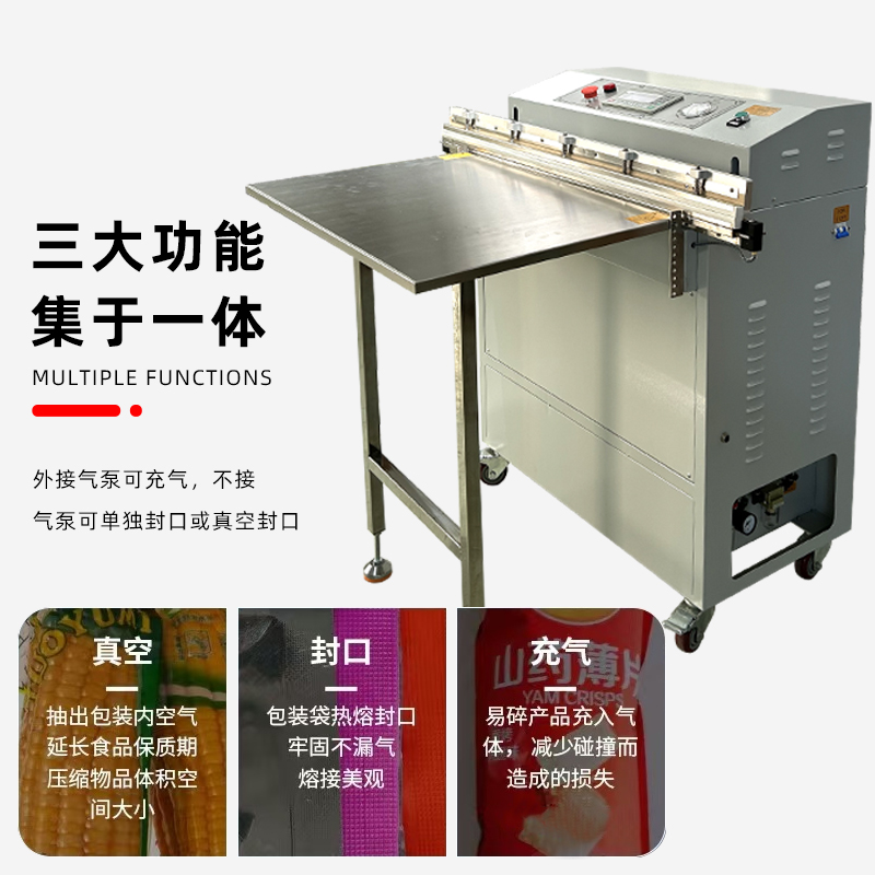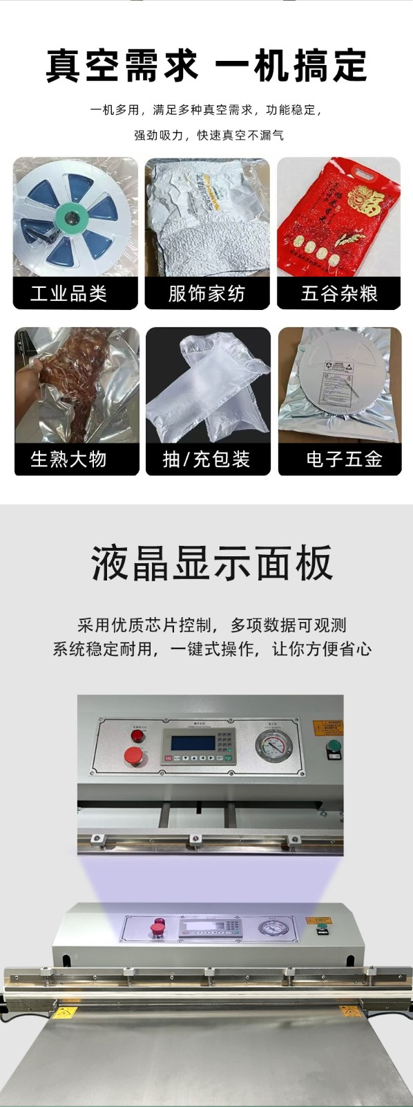 外抽真空包裝機不受包裝容器形狀和尺寸限制,無論是大型工業零部件還是小型家用物品,只要抽氣口能與抽氣嘴連接,均可進行真空包裝