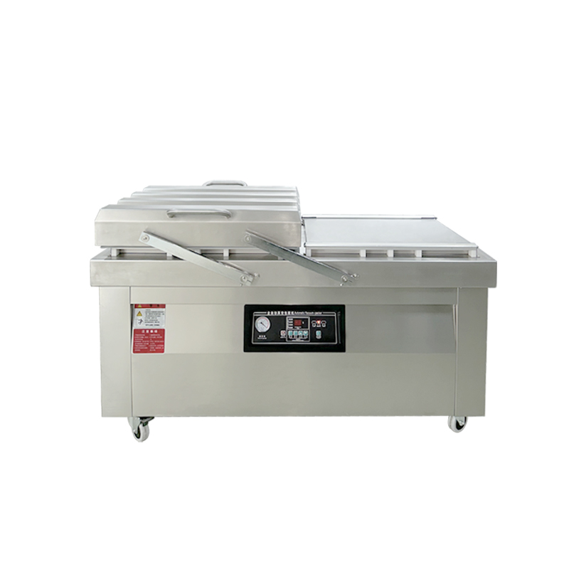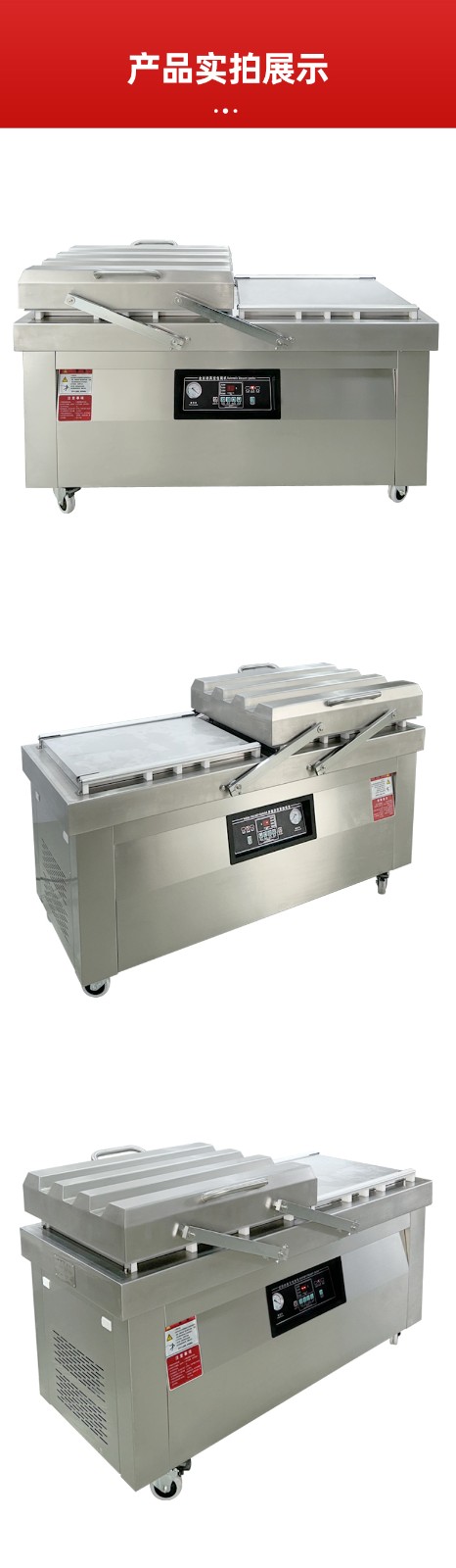 - 交替作業,效率提升 50% 以上雙室機型的兩個真空室可實現 “一工一備”:當其中一個真空室正在進行抽真空、熱封作業時,操作人員可以在另一個真空室完成物料擺放、袋口整理的準備工作。單室機型則必須等抽真空 - 熱封 - 開蓋取件整個流程結束后,才能進行下一批物料的擺放,存在明顯的操作等待空窗期。同等規格下,雙室機的單位時間包裝量是單室機的 1.5-2 倍,尤其適合中小型加工廠的連續批量生產。